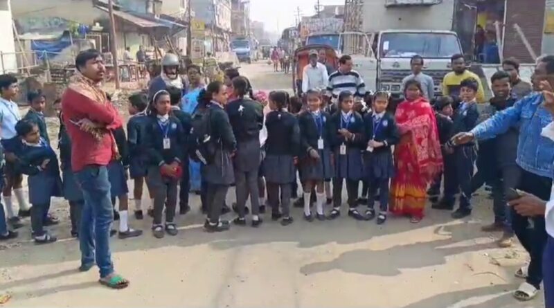 যানবাহন পার্কিংয়ের প্রতিবাদে সড়ক অবরোধ আন্দোলন সখিচরণ বিদ্যানিকেতনের ছাত্রছাত্রীদের